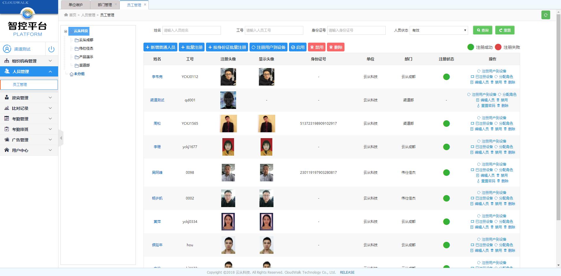 2.人员管理:公司人员信息管理、人脸库维护、人脸注册等。