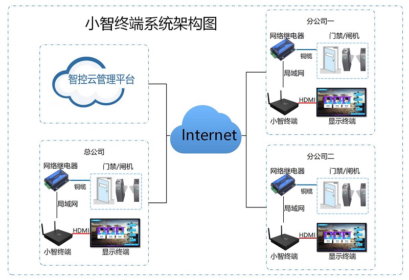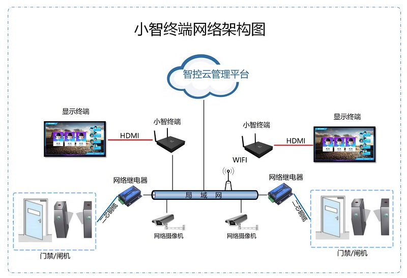 小智智能识别终端完成人员识别,方便快捷的帮助公司进行智能迎宾、前台考勤和门禁,会议室签到等功能,可根据公司情况多通道部署多台考勤识别终端,满足不同规模的人脸识别需求。终端自带HDMI显示出入接口,可连接大屏显示器对识别情况实施展示,也可通过语音输出连接音响设备进行识别语音播报,识别同时智能终端通过网络发送开门信号给门禁控制继电器模块,实现考勤同时开门。